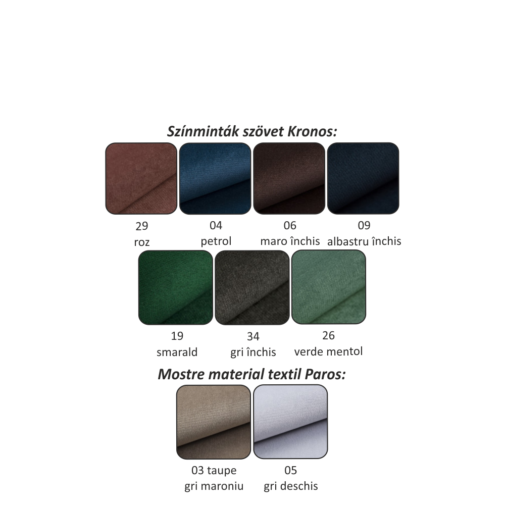 Posibilitatea de a comanda în 7 nuanţe a materialului textil Kronos şi în 2 nuanţe a materialului textil Paros. Durata de livrare este de 14-17 săptămâni.