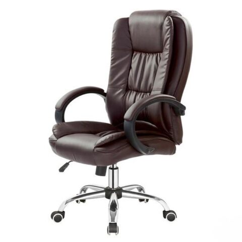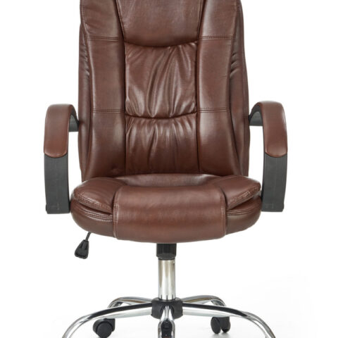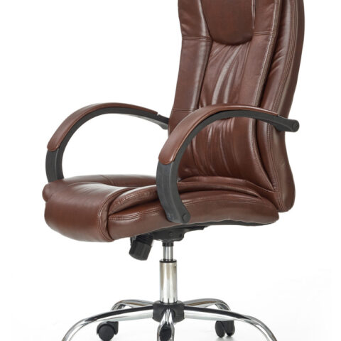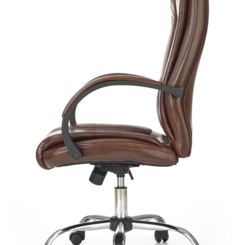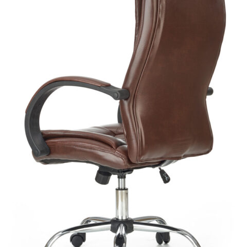 Scaunul are baza stelara din metal cromat, tapiterie din piele ecologica maro inchis si brate din plastic dur acoperite cu piele ecologica.